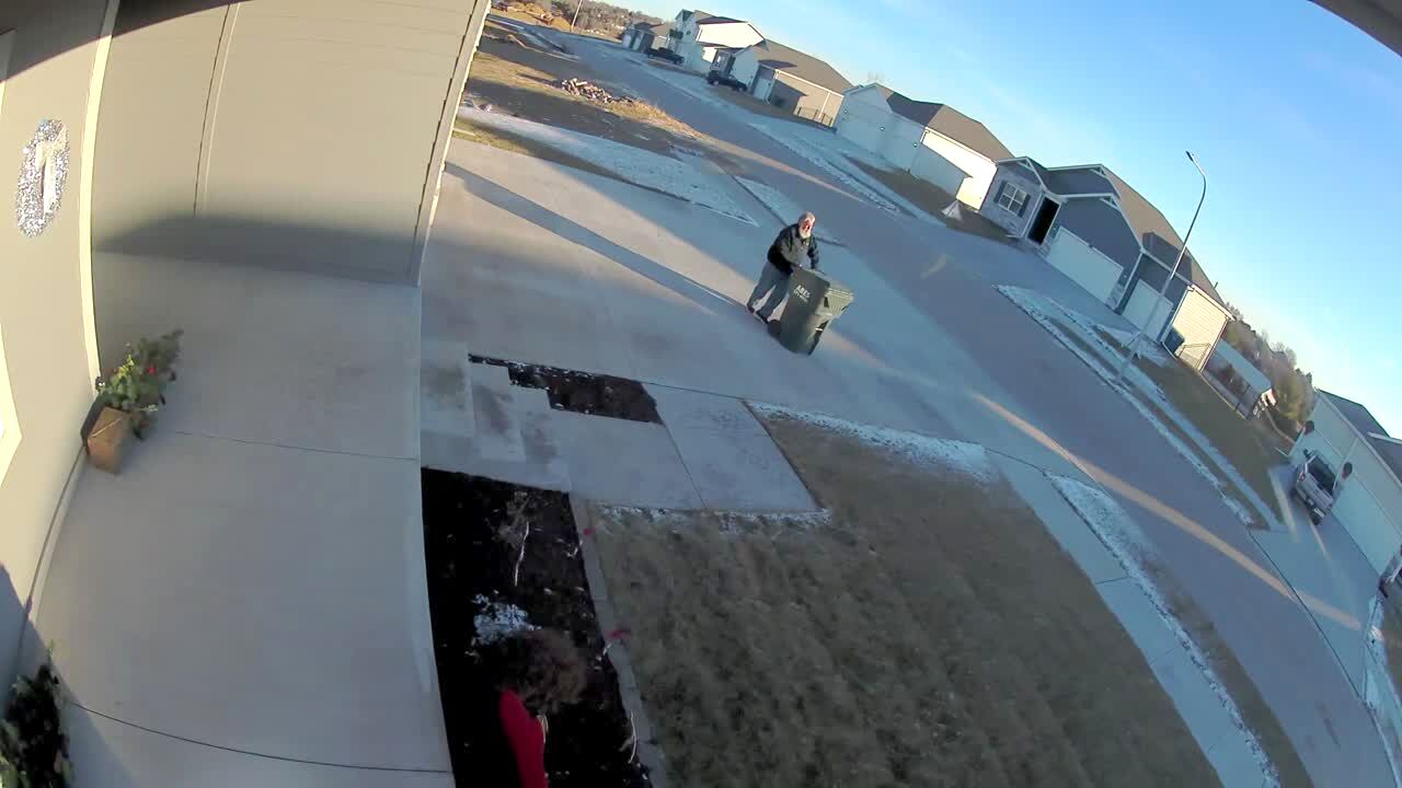 A man rolls a garbage can up the driveway and the lid blows up and hits him in the face. Security footage.