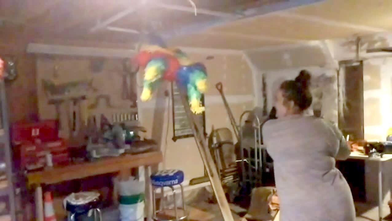 A pinata hits the camera when a woman hits it with a bat and it comes loose from the ceiling in the garage.