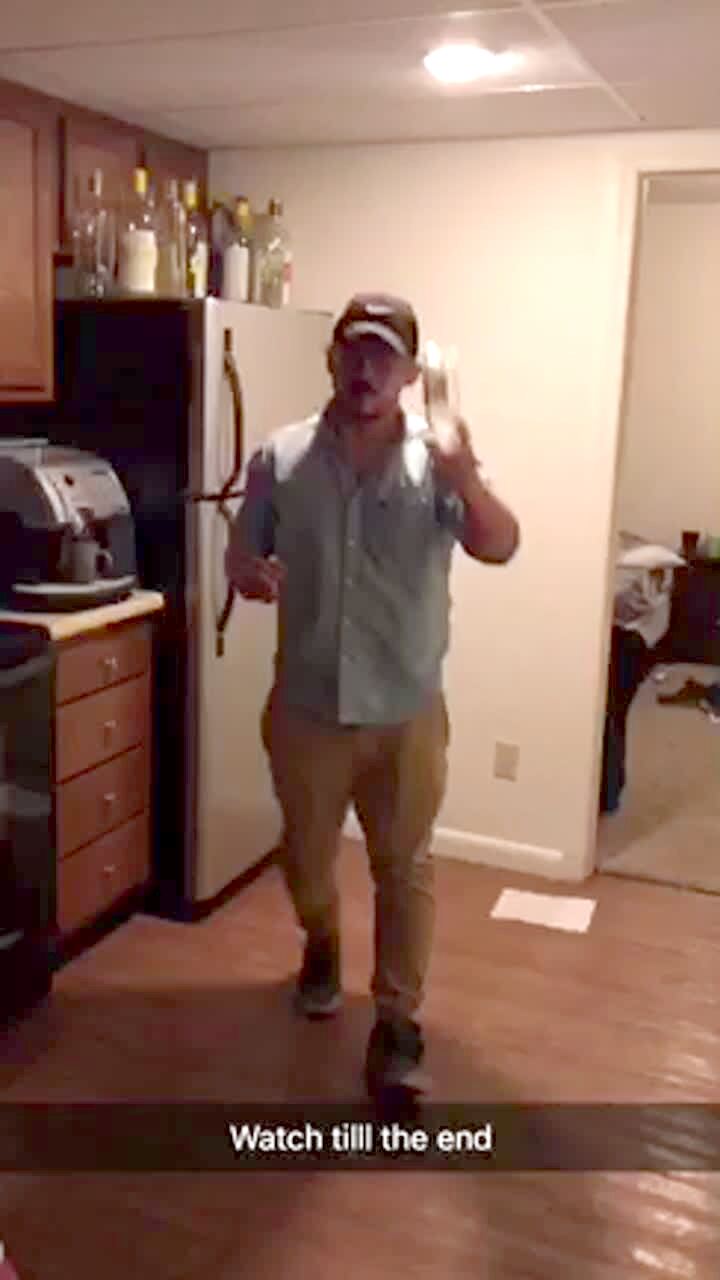 A man throws a beer bottle on the kitchen floor until it bounces into the oven and breaks its glass door.