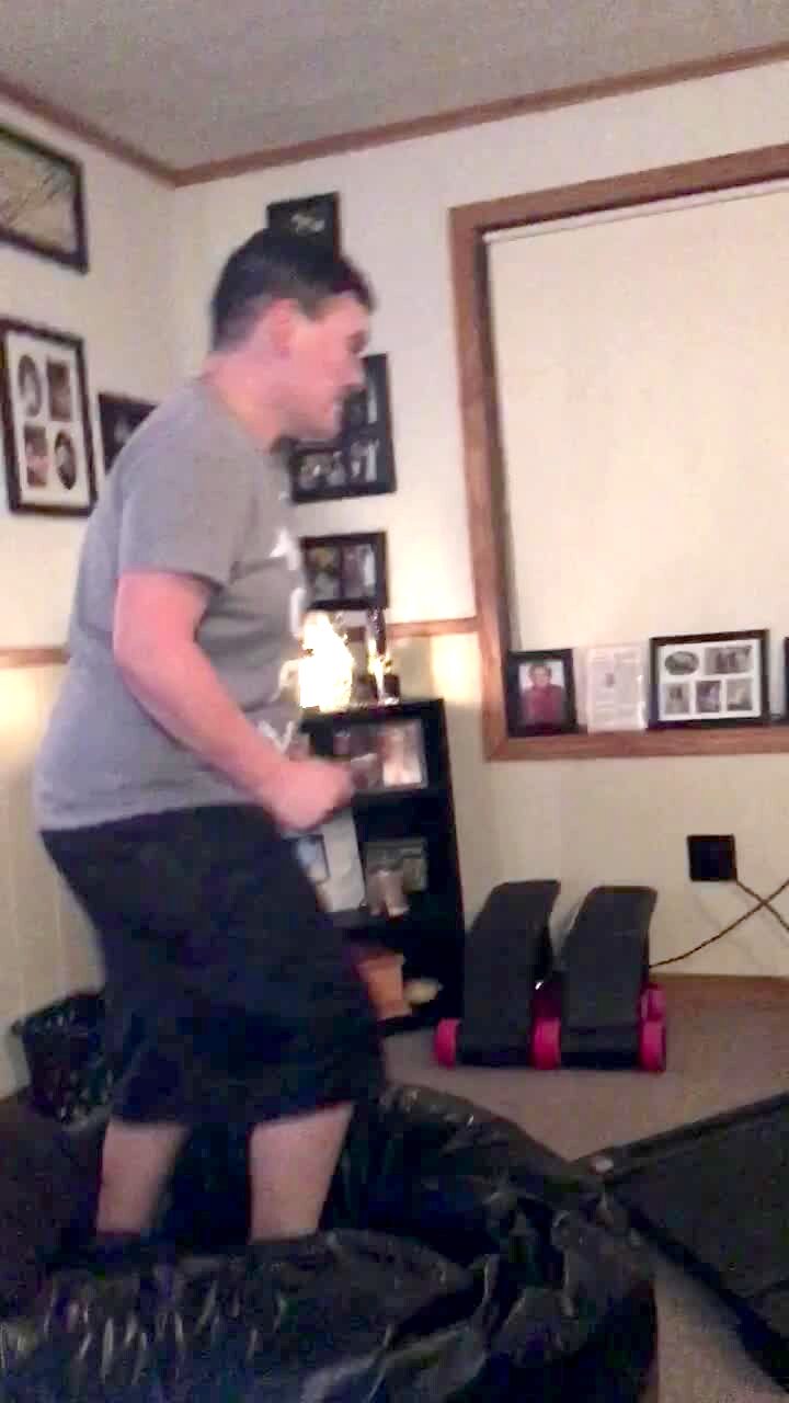 A woman attempts a box jump while exercising at the gym. She hits her head on a TV that hangs from the ceiling and it falls on her. Featured talent cleared only (the woman who jumps onto the platform).