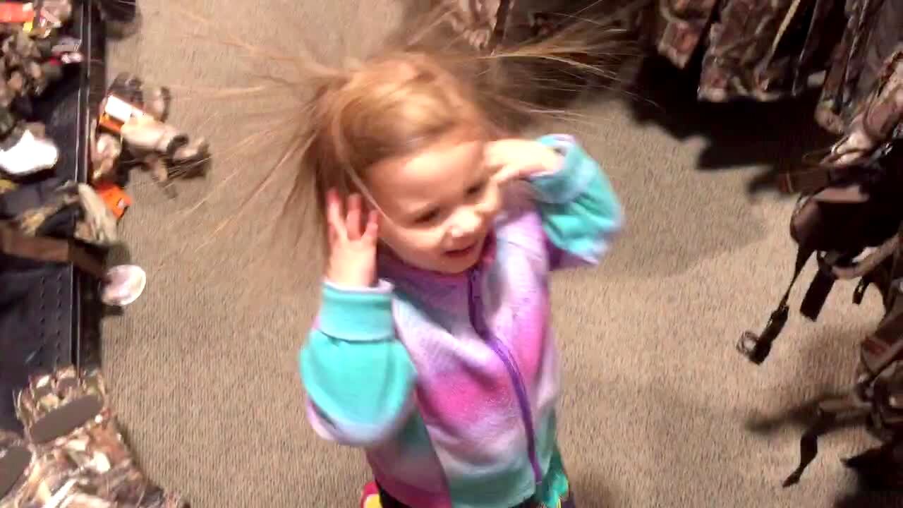 A young girl gets her hair stuck in a window well in the backyard. She yells for help, but her dad says "can't you just push up on it," so she does and breaks free.