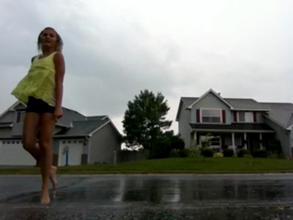 Teen girls dance in rain puddles and get scared by thunder and lightning.