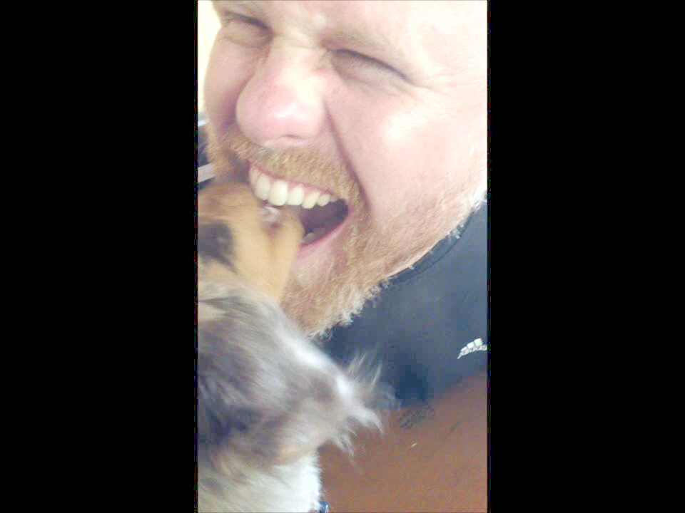Woman says "nice little puppy" when tiny Pomeranian kisses man. Then woman shrieks "Cujo puppy!" and man shakes dog, dog freaks out, growls, bares teeth. Goes nuts. Then dog goes back to kissing man. dog
