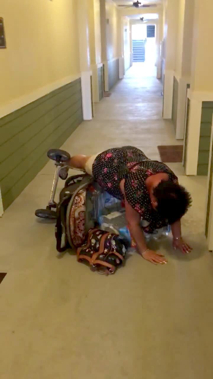 Three young girls do cartwheels into padded chairs that tip over so they sit upright.