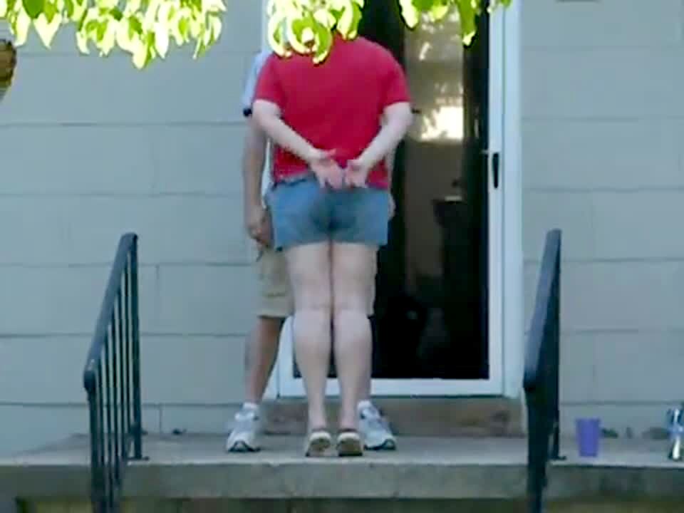 Man woman dance together on a porch, woman bends down and jumps up onto a man who's not expecting it. He falls forward and lands on top of her. Boneheads.