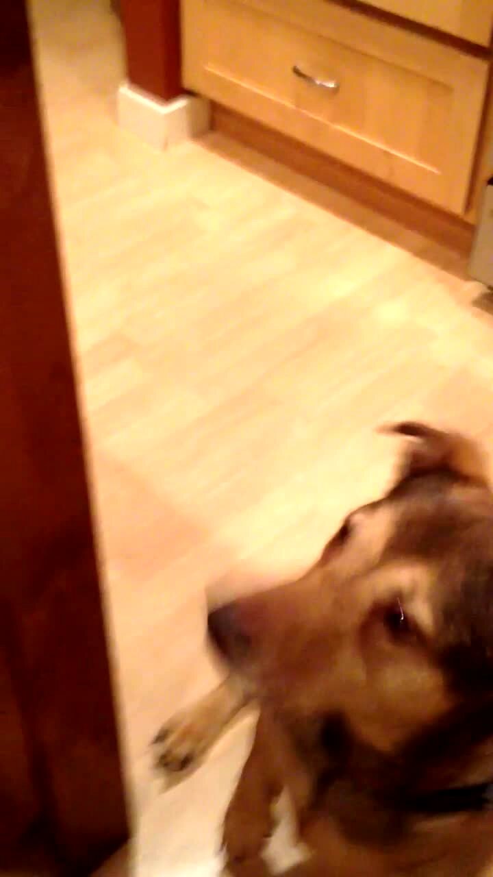 A man tells his dog that if she wants to eat, she has to bark Beethoven's 5th. The dog barks four times and it sounds like Beethoven and the man gives her the food. Pet trick.