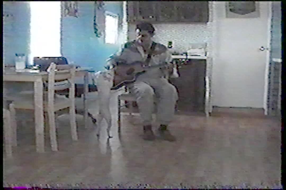 White dog dances when man plays guitar. Dog stands on hind legs & looks as if he's clapping his paws together and dancing, trying to play guitar with man. Man sits on a chair in the center of the kitchen.