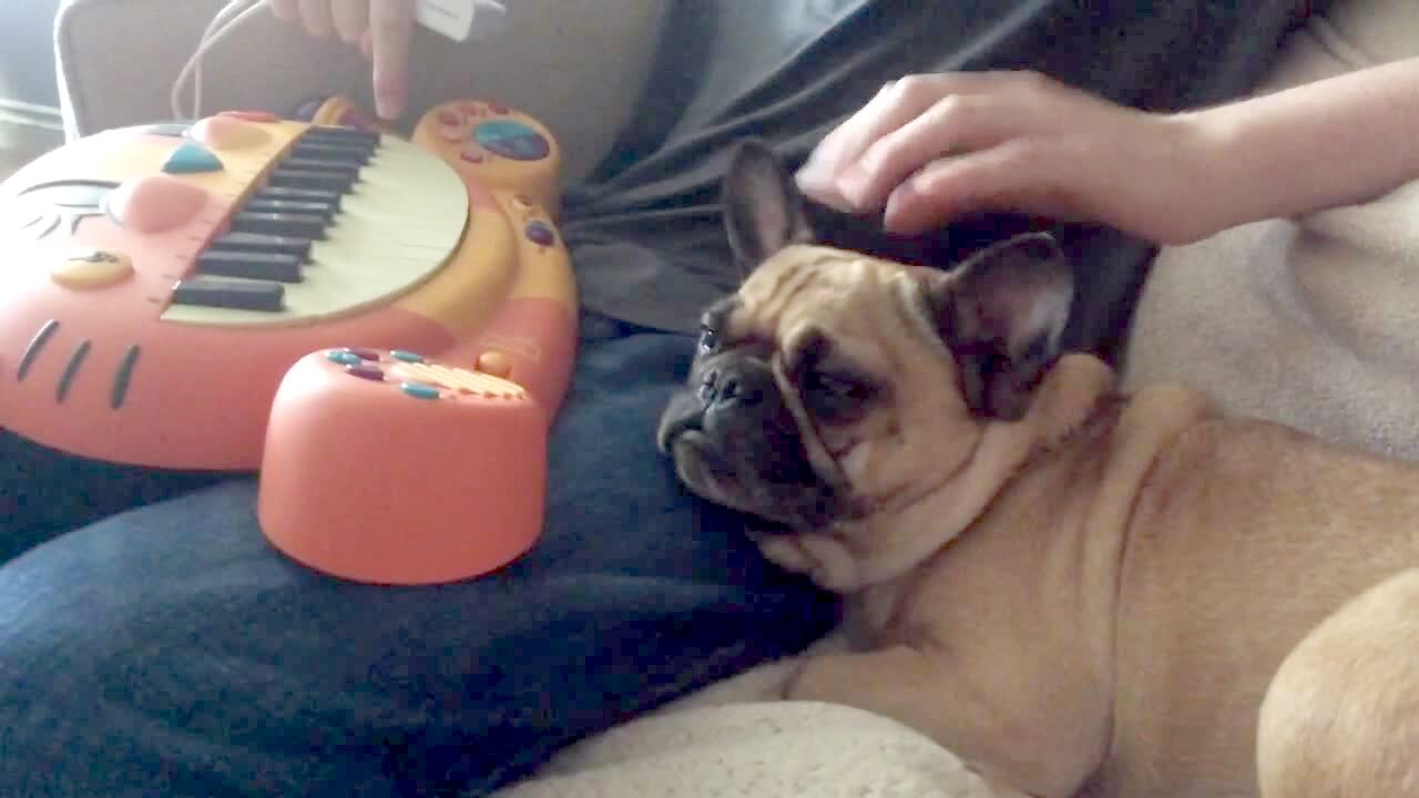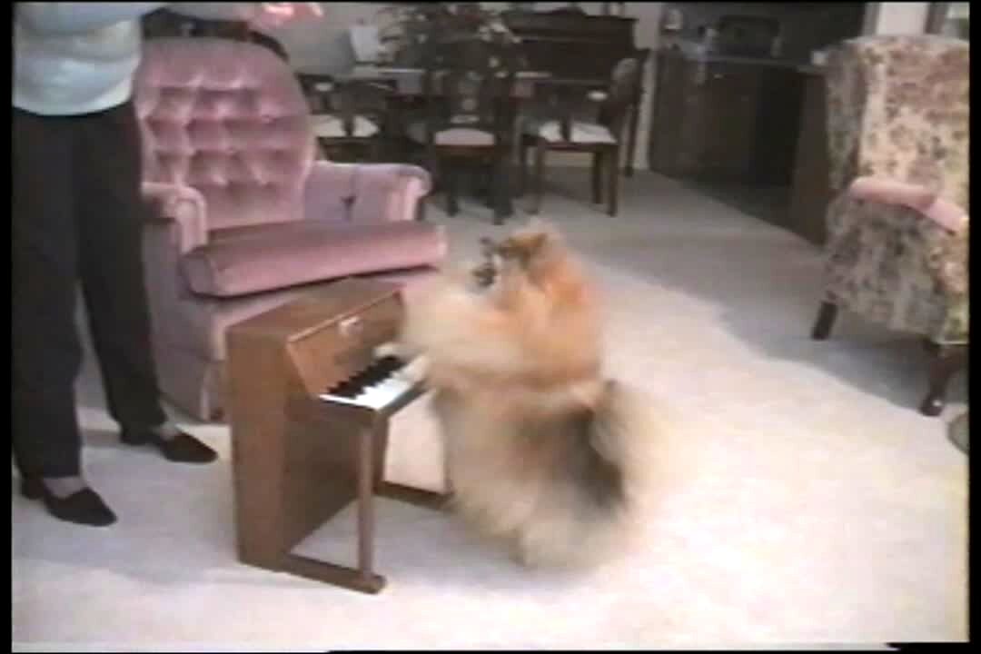 Small fluffy dog plays a toy piano. Annoying pet trick.