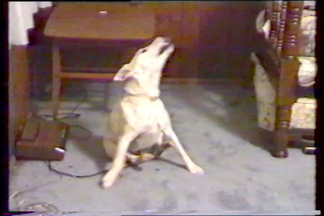 DANCING DOG. Dog dances on his butt as drum machine plays. (montage)