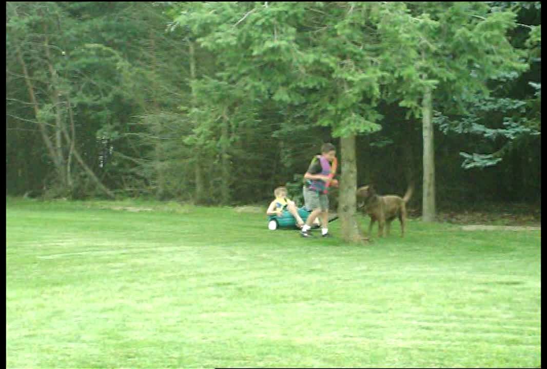 Small dog pulls little girl in toy car down driveway & sends her crashing into a fence.