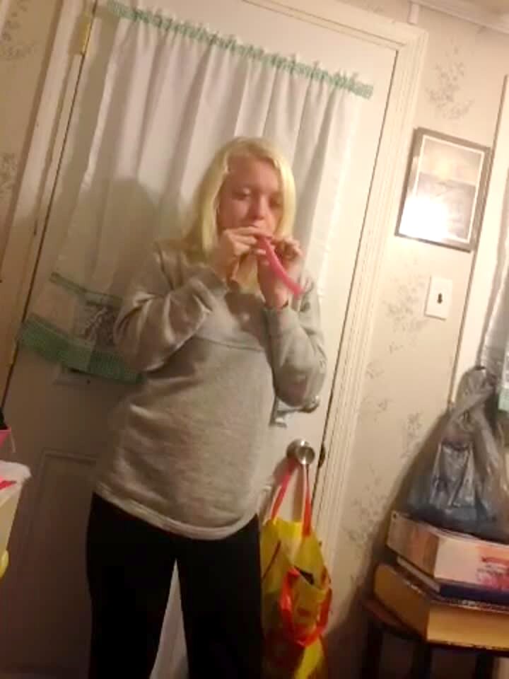 A teen girl blows up a balloon at home. It explodes and snaps back, hitting her in the eye.