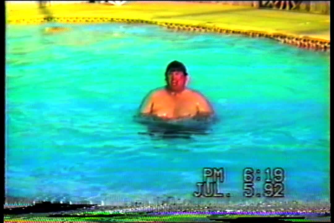 Dad jumps into pool and the diving board falls into pool. No tail.