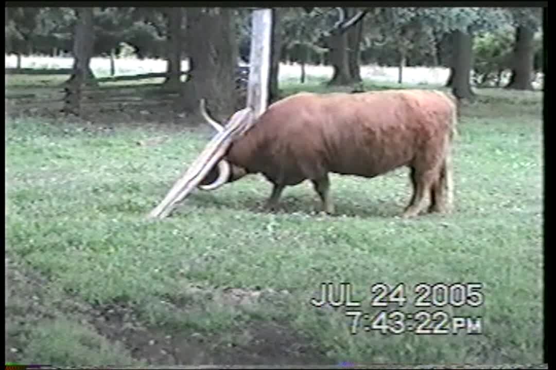 Cow / bull plays with wood fence post. Lifts it off ground and balances it on horns. Silly pet trick. Farm.