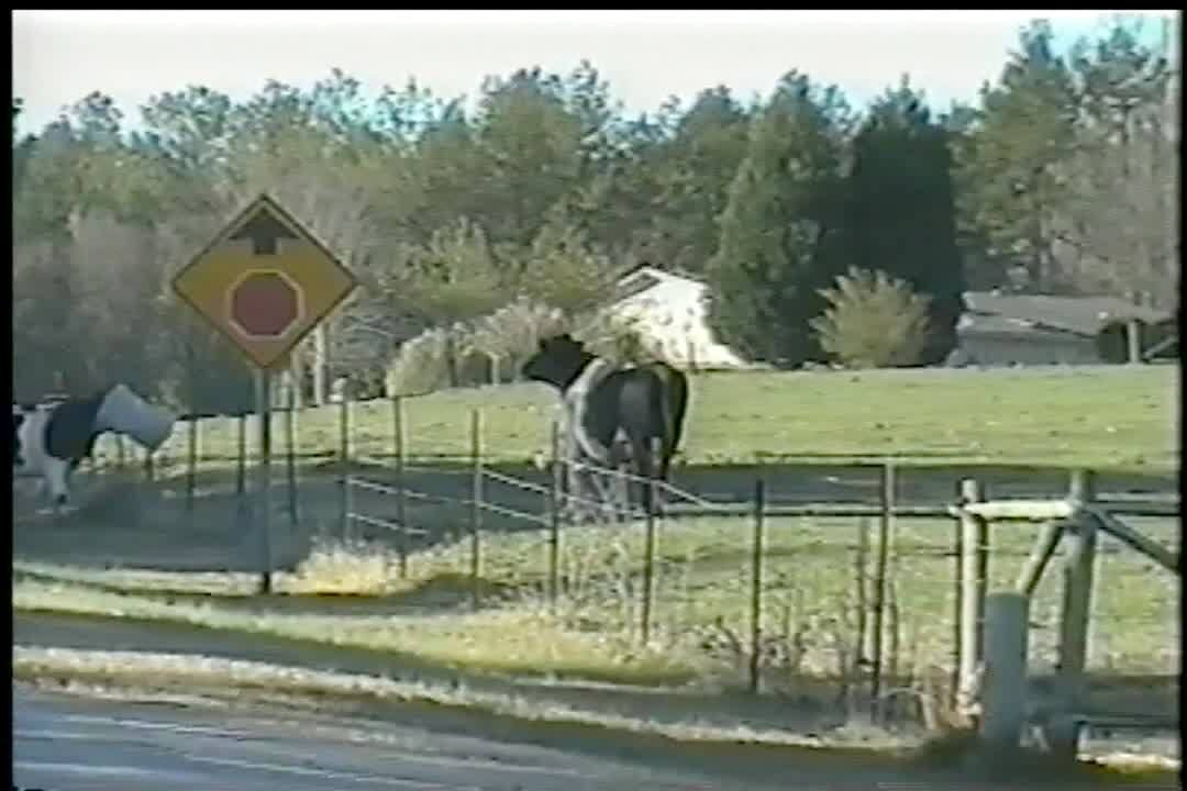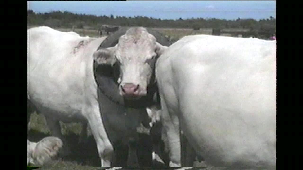 Man driving truck moos over PA system on truck, herd of cows in field starts to chase truck up and down road. Animals. Farm. Unusual