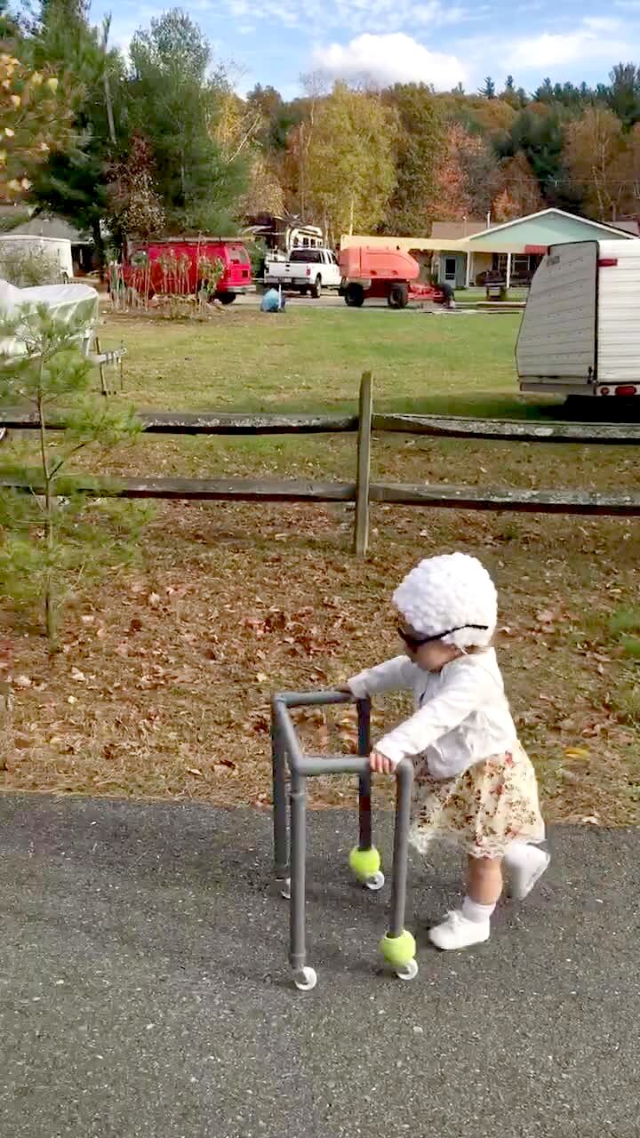 A tot girl pushes a homemade walker down the street while she's dressed as a senior woman.