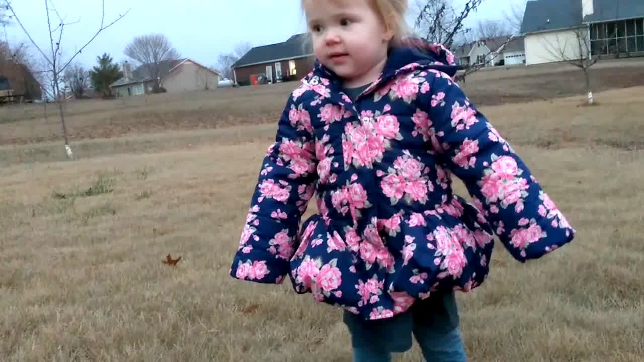 A tot girl runs to an easter egg in a backyard and tries to pick it up while a man pulls it on a string to keep it out of reach. The girl repeatedly says, "Come to me" as the man raises and lowers the egg, then another tot girl tries to help but can't grab the egg either.