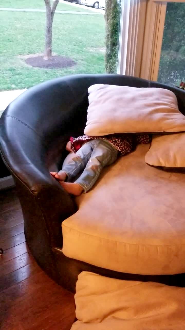 A tot girl hides under a pillow on a couch, but her legs can be seen. Her mom asks her if she is in various locations and she says no and talks to her mom.