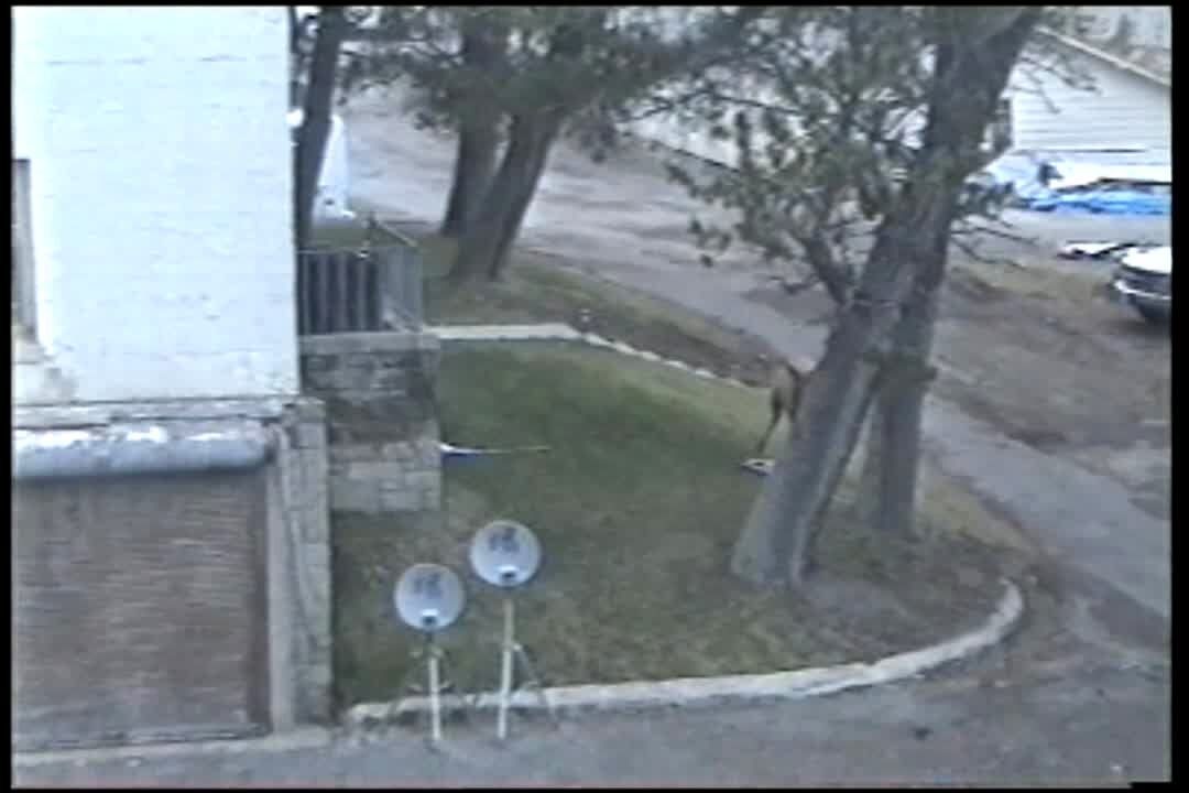 Young elk takes man's American flag and plays/ dances with it. Elk wearing American flag.