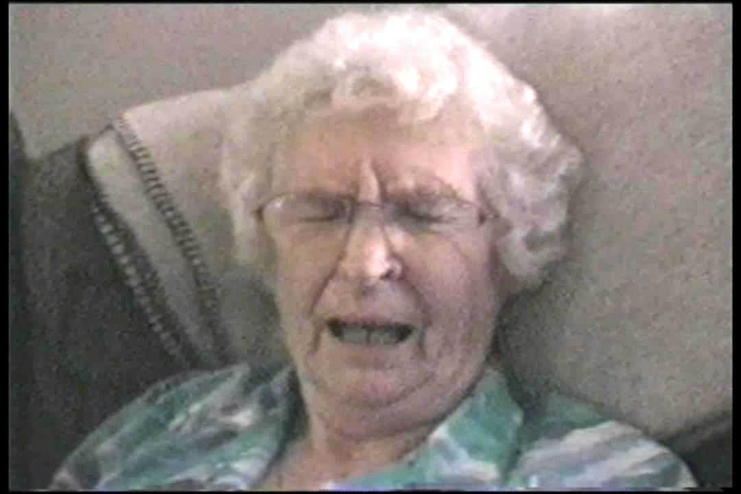 Teen boy tries to get his grandma to say tongue twisters: "A skunk sat on a stump" & "Rubber Baby Buggy Bumpers." Senior woman says them in a funny way.