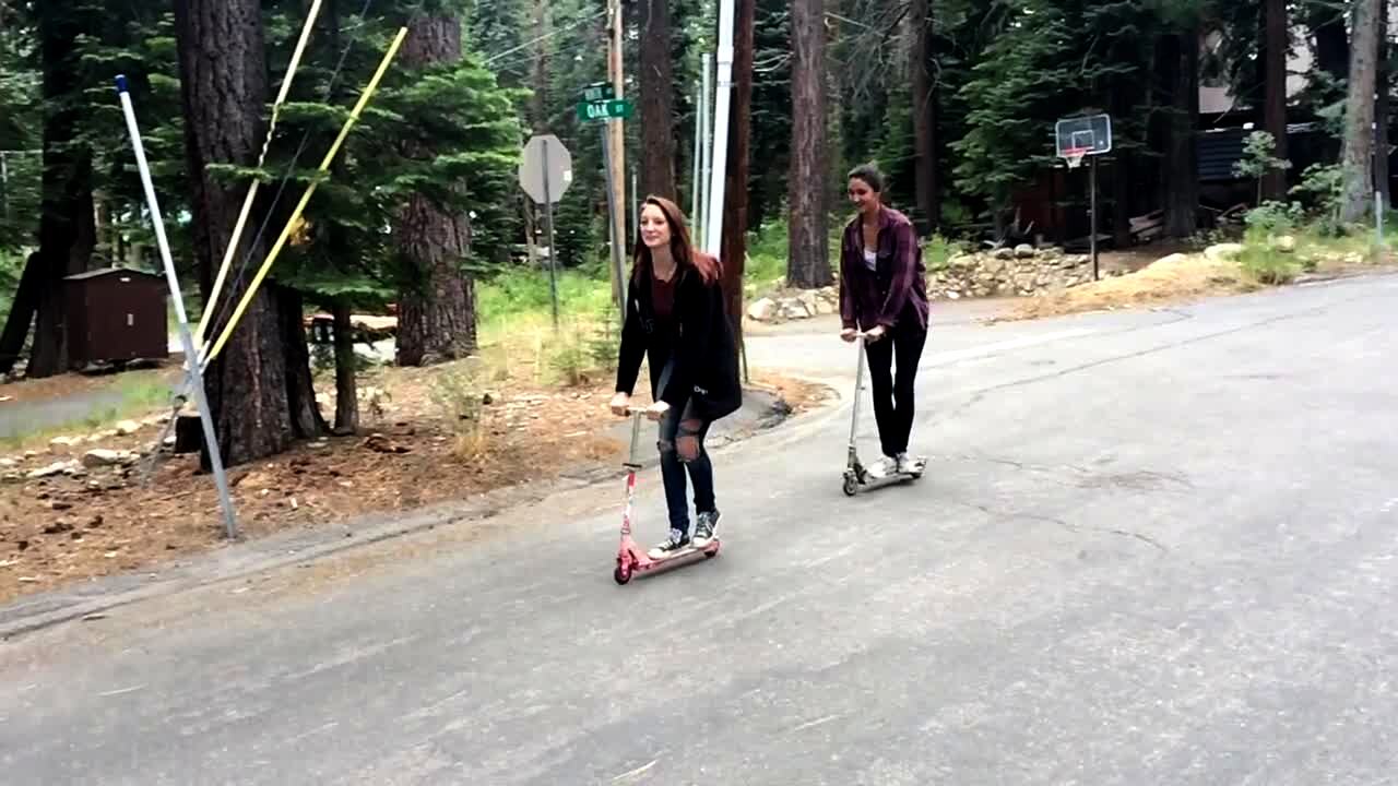 Two teenage girls ride down on hill on children's scooters and first one of the girls falls down and smacks her head on the tar, then the other girl falls down.