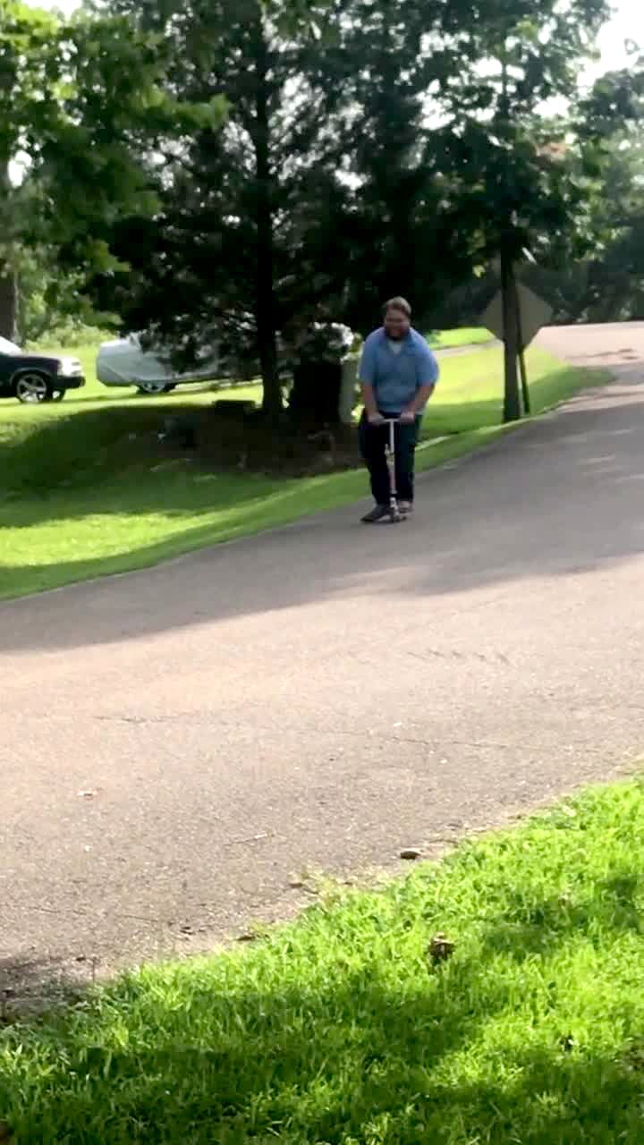 A man drives a seated motorized scooter down a hallway inside of a building. He screams and crashes into a wall, then spins around uncontrollably, and crashes again. He leans backward, and crashes into a door. Multiple videos put together. Slow motion video at 00:40.