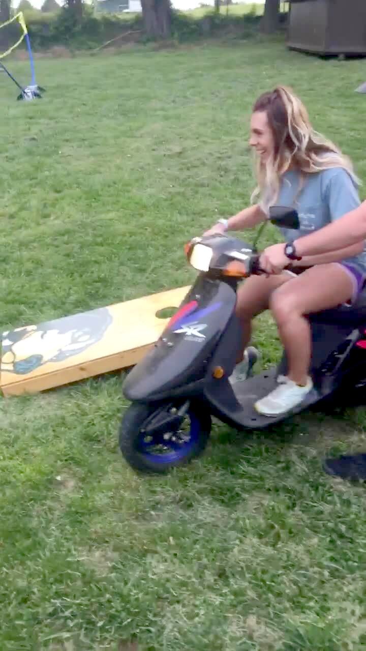 Two women ride electric scooters on a sidewalk and their moms drive in a car past them and scream "woo". The women yell back but crash into each other and fall down and the moms laugh and look surprised.
