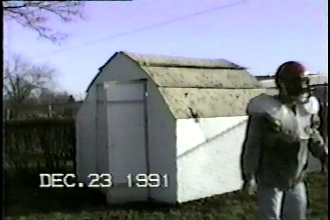 2 adults men put on football pads and run through a shed. Destruction. Boneheads.