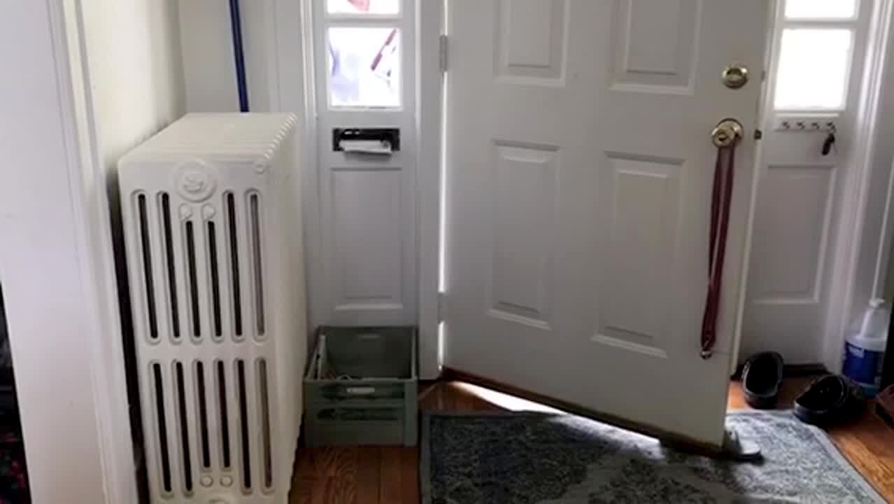 Someone sticks mail through the mail slot in the front door. A dog runs to the door and grabs the mail in his mouth and destroys it.