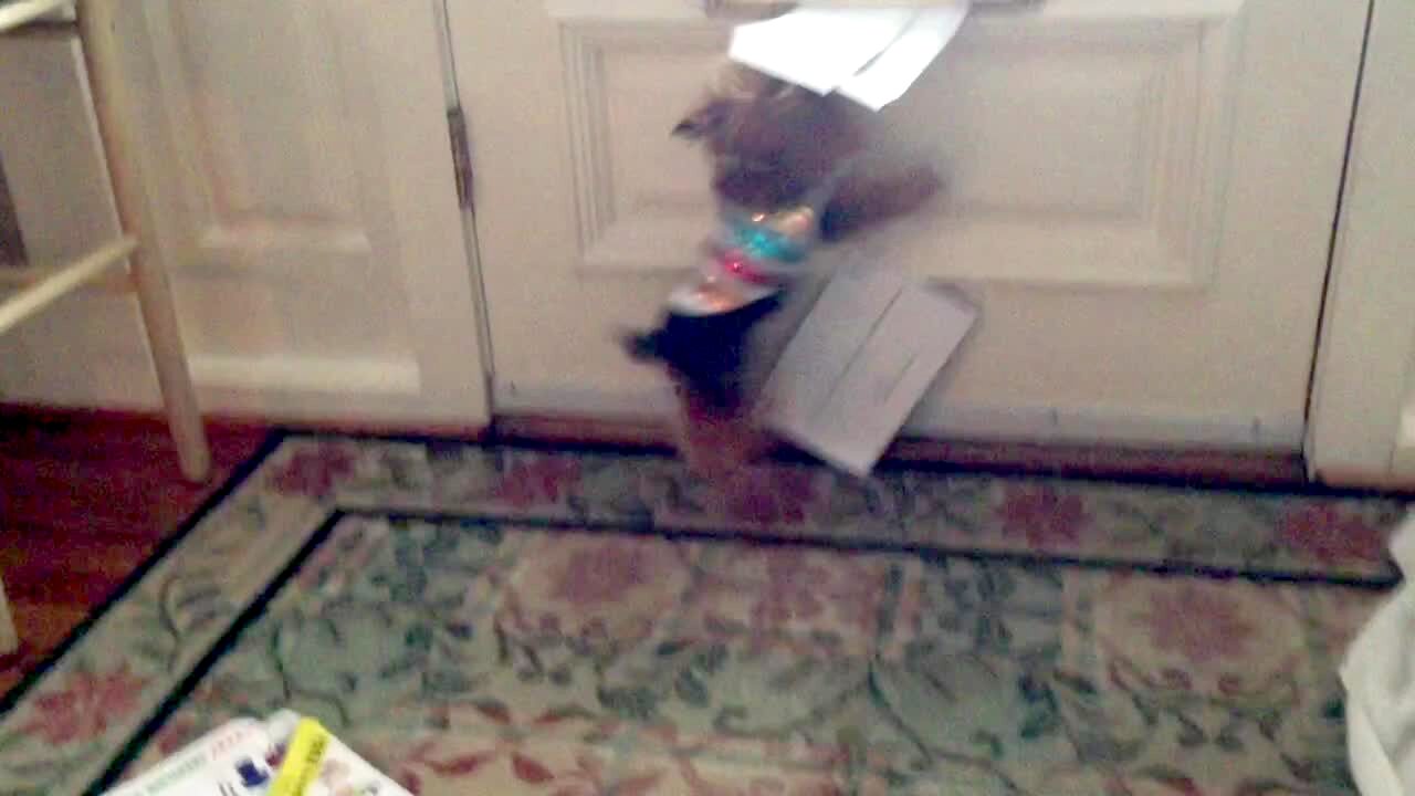 A teen girl tries the "What The Fluff" challenge on her dog. She drops the blanket and tries to hide, but walks into a door. Her mom laughs.