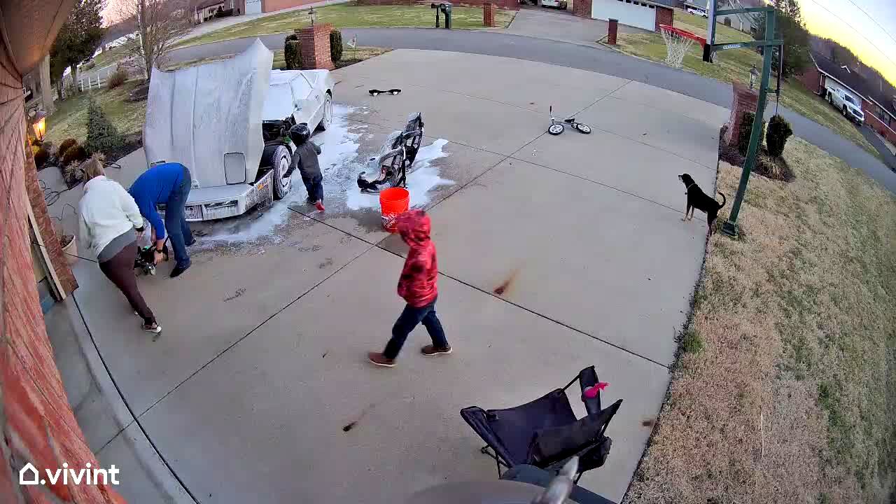 A tot boy falls backwards into an orange bucket of soap water while his dad washes a car in the driveway. Security Camera Footage.