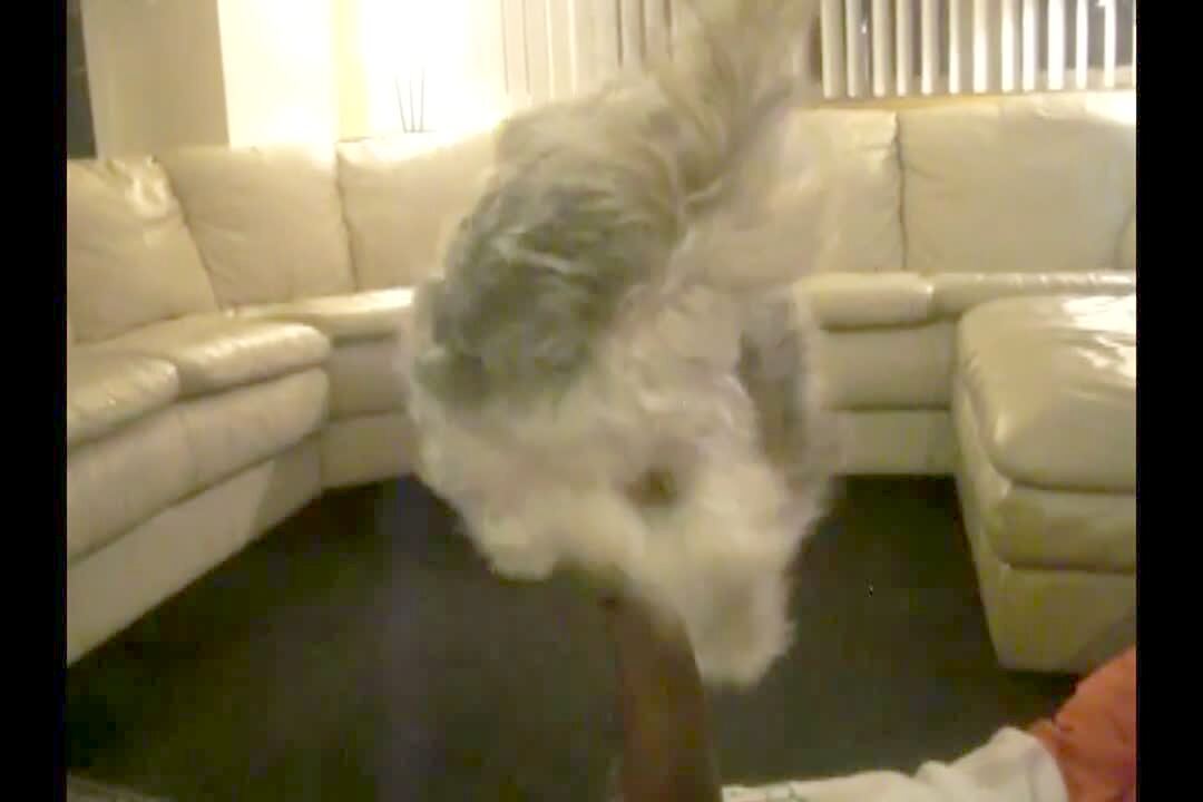 A woman finds her dog with shredded pillow fuzz on the floor and asks if he did it, and the dog grins and acts guilty.