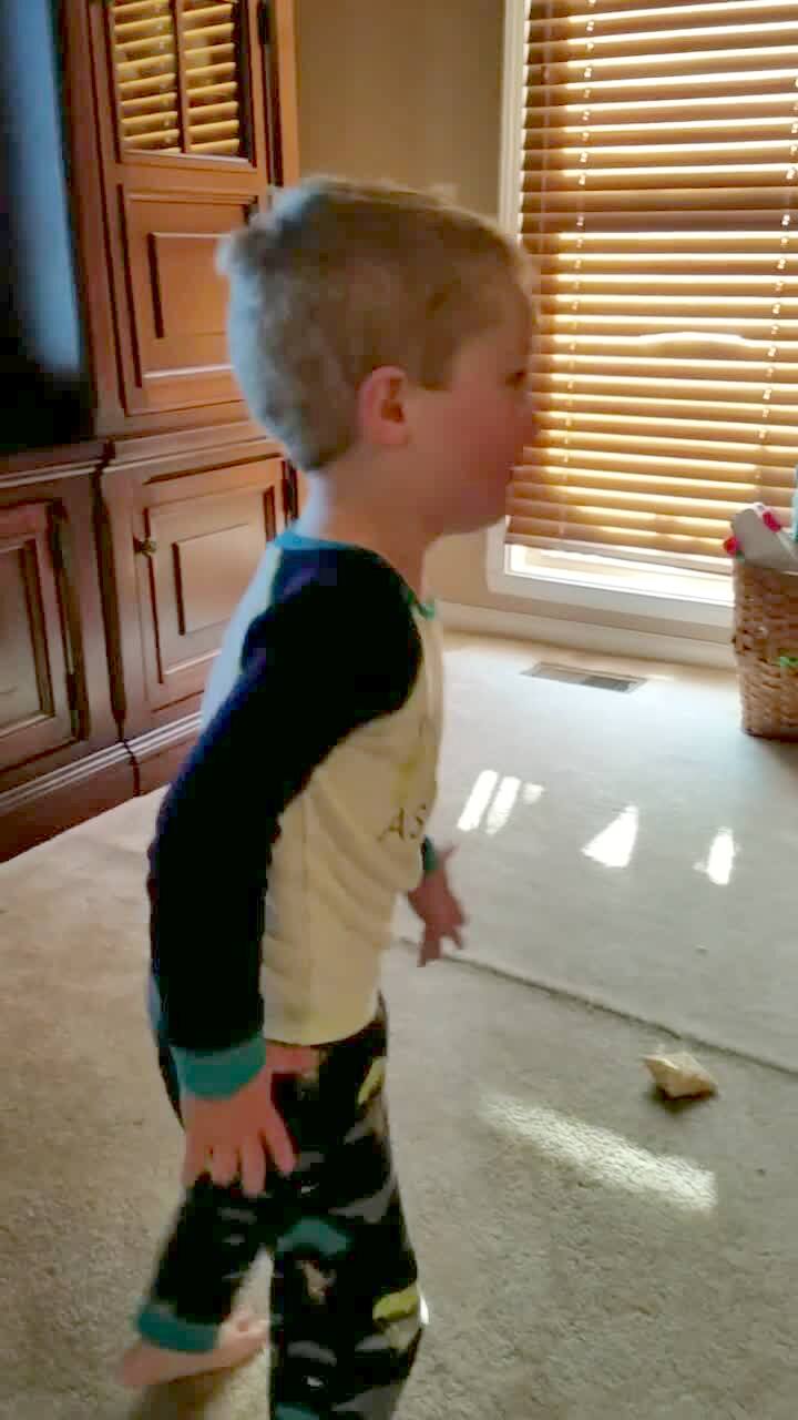 A tot boy screams and cries in the kitchen because AFV is not on the television that Sunday night.