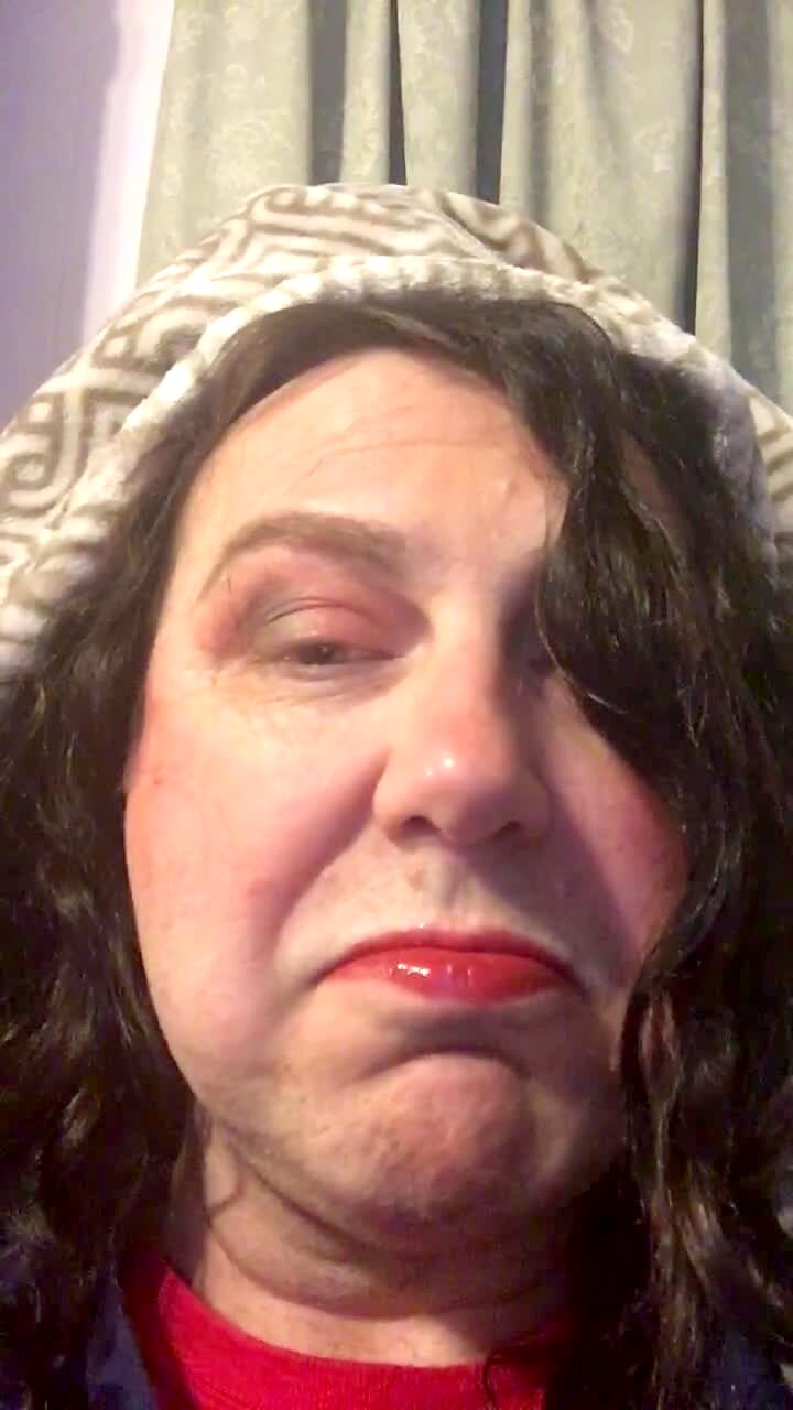 A man wears fake hair and make-up and films himself indoors before his daughter reveals that the fake hair is actually hers as she hides behind her dad. AA: Makeup your dad.