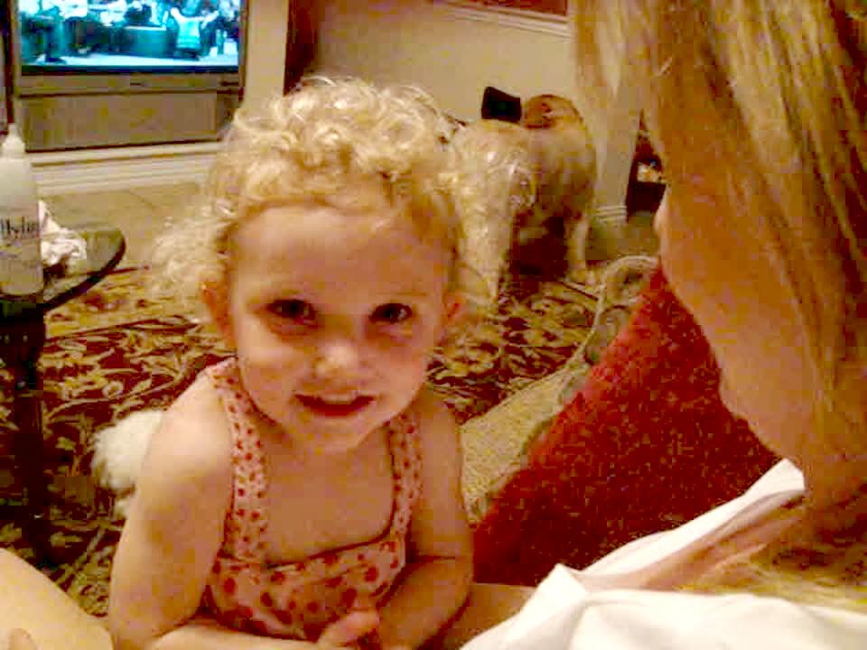 Dad asks tot girl how her mom sleeps & girl makes a snoring noise while sitting in mom's lap. Cute.