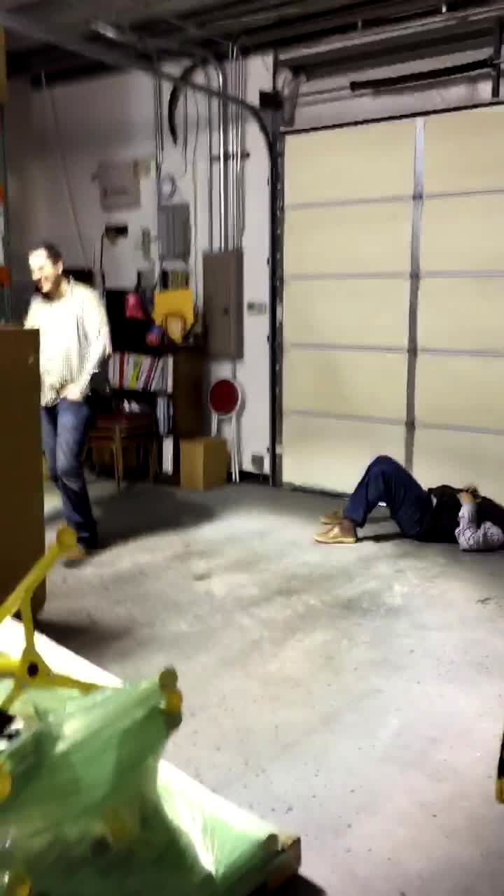 Man in warehouse opens huge cardboard box, man pops out of box and yells "Hey Jim!", scares / surprises man. Practical joke. Video shot from above. Hidden camera.