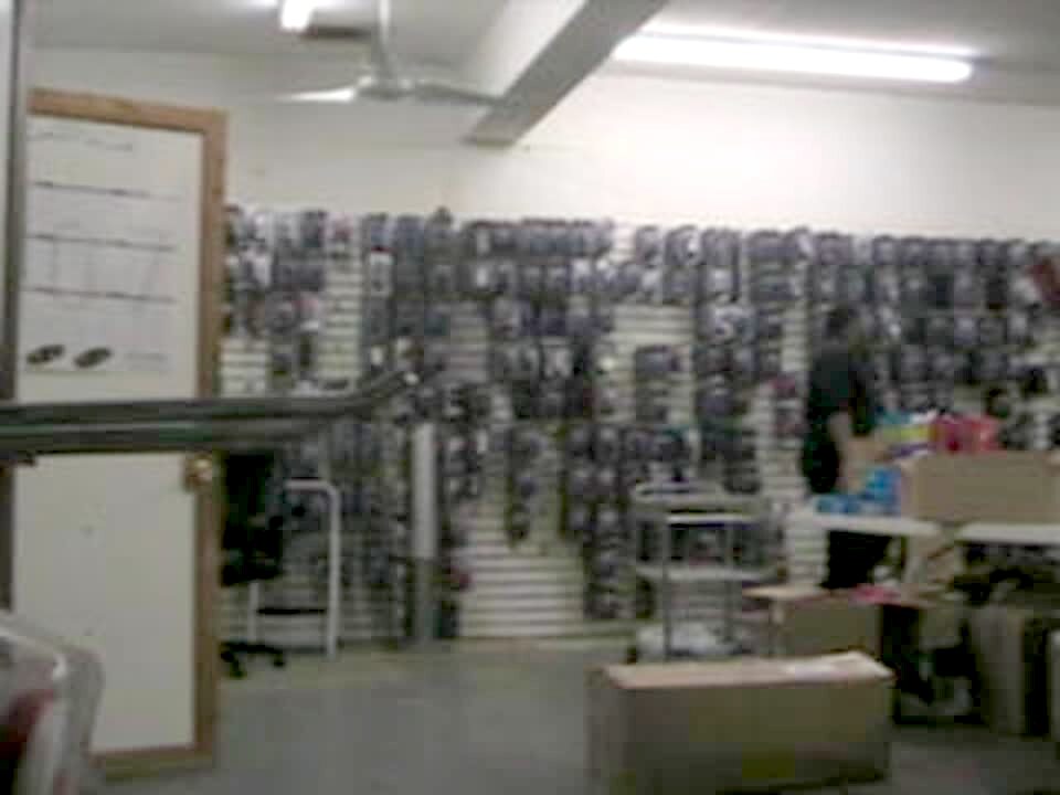 2 men work in electronics store. Woman jumps out of a box & surprises man and scares him. Practical joke.