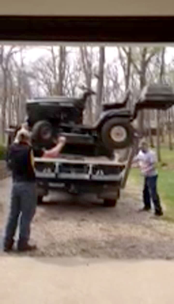 Two men raise a tractor lawn mower into the back of a truck using a lift but raise it too high when they try to pull it on and it flips and crashes down.
