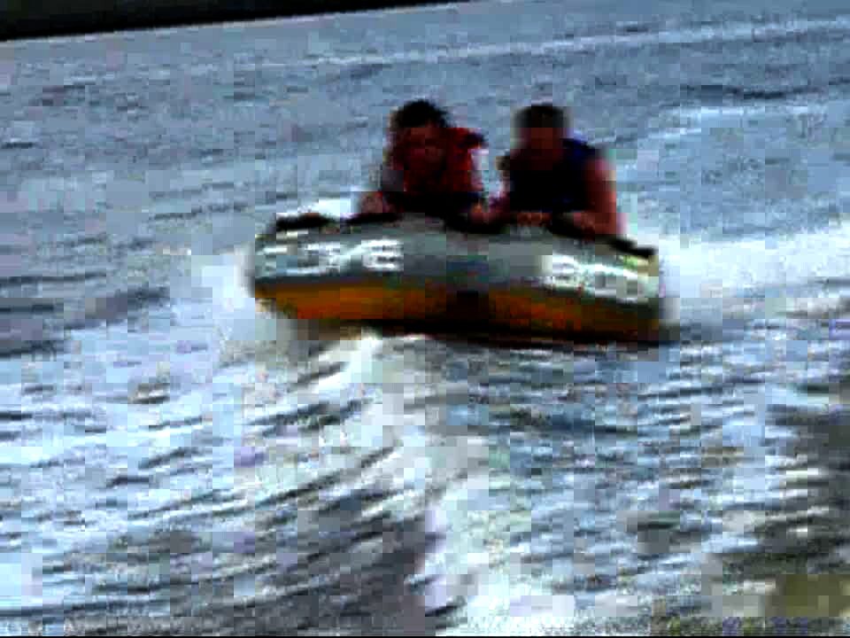 2 men on a raft being pulled by a car in the snow hit a bunch of trees.