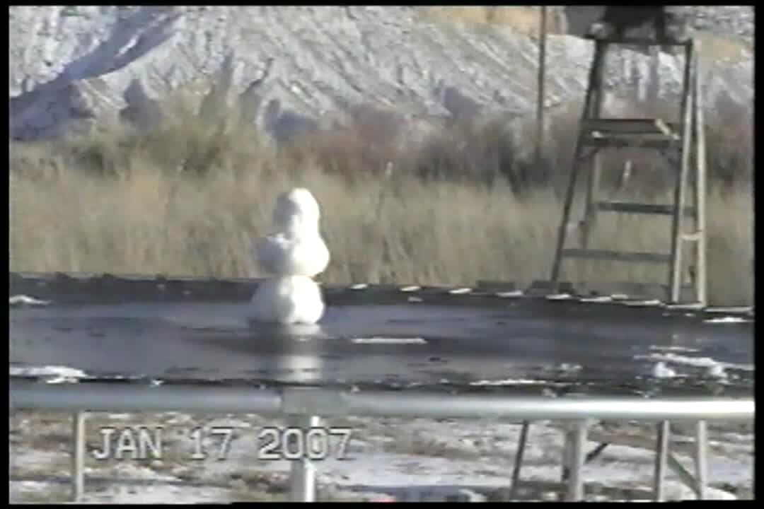 Teen boy attempts to jump over snowman but his base of snow crumbles and he hits, runs into, the snowman. No tail.