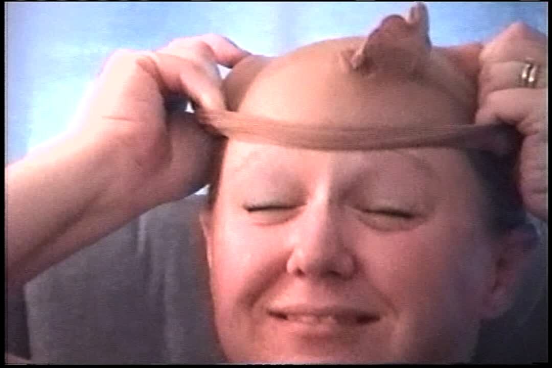 A young girl keeps a silver handkerchief afloat by blowing it up in the air with her mouth, then gags when it almost falls into her throat.