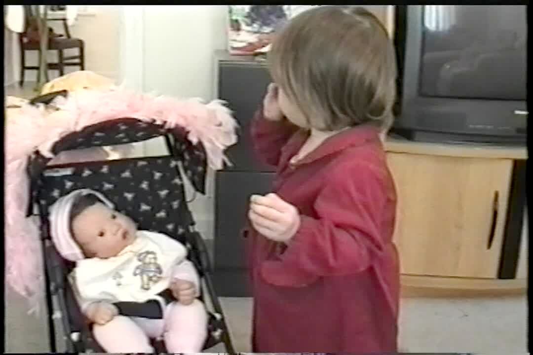 A tot girl get lotion in her nose when she squeezes a tube of lotion after her mother tells her to smell it.