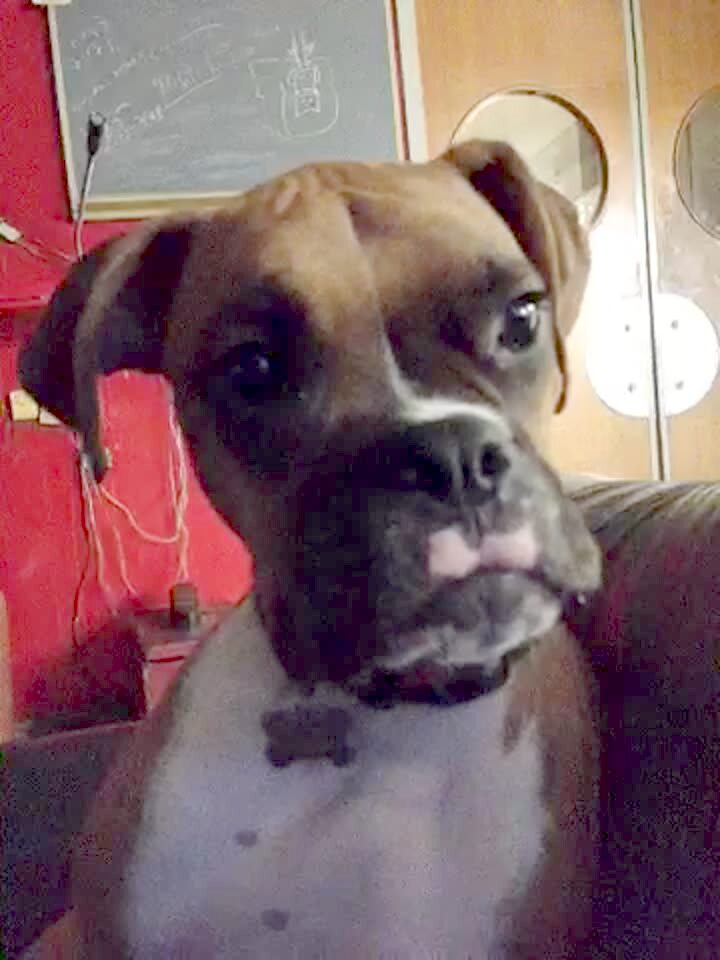A man asks a young boy if he fed their pit bull dog in a living room, and he says "yes," then the man asks the dog if he was fed, and he looks at the camera and growls.