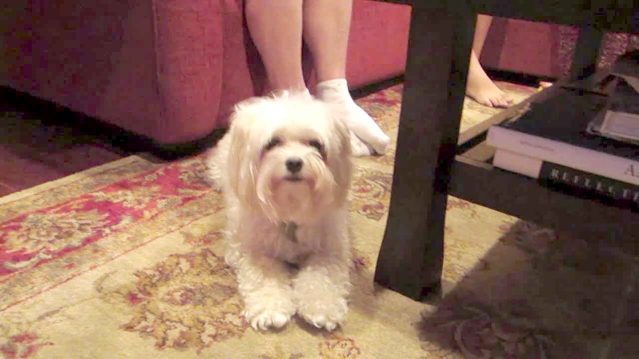A man off-camera tells silly jokes to his dog, and the dog curls its lips and smiles.