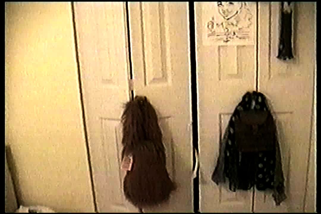 A woman opens a closet/pantry door in the kitchen and gets scared and falls when a boy in a mask jumps out at her.