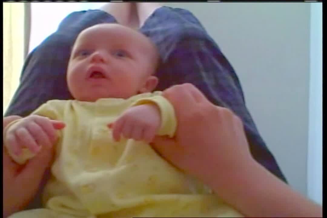 Baby girl in high chair dances and shakes her head back and forth to the music. Camera cuts to twin brother who's scowling at his sister, then cuts back to girl who's smiling and dancing. Sibling rivalry.