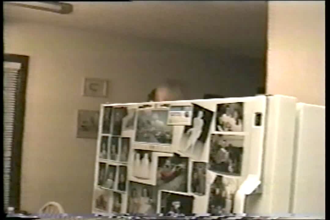 Baby girl repeatedly flies into view over refrigerator. Dad is behind there throwing her up in the air