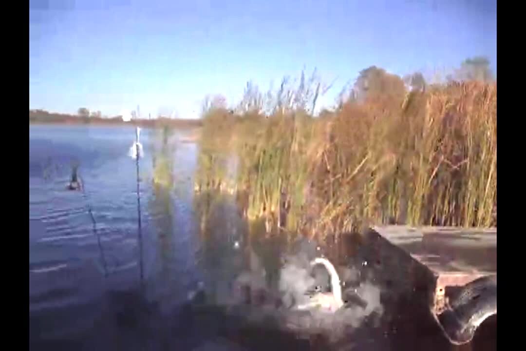 A yellow lab dog runs down a dock. It tries to stop, but slides down the dock and falls into a lake. No heads. Short tails.