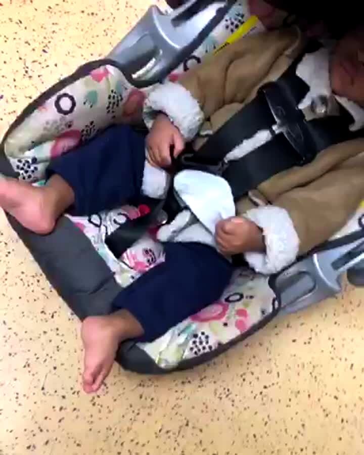 A man screams in the car when three women and a man scream to wake him up while he sleeps.