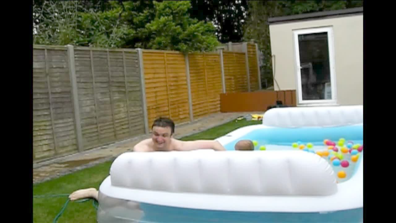 Dad runs in the garden, he slips and falls, drops baby boy into a pool.