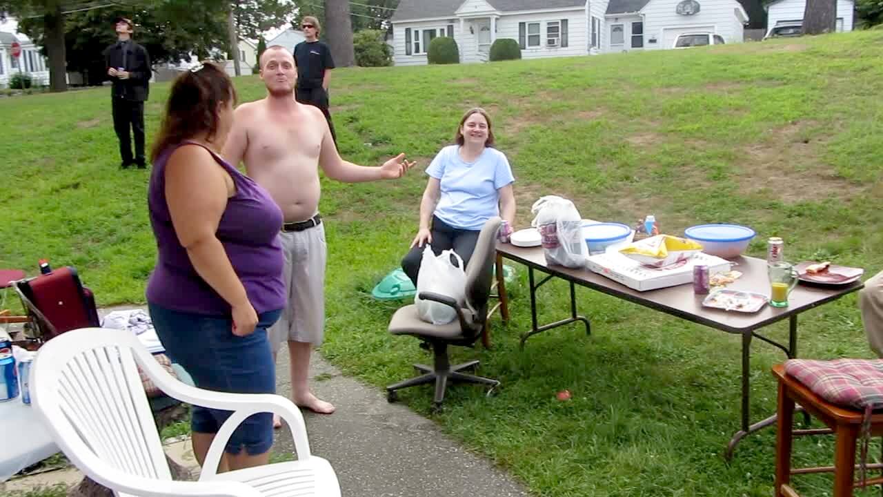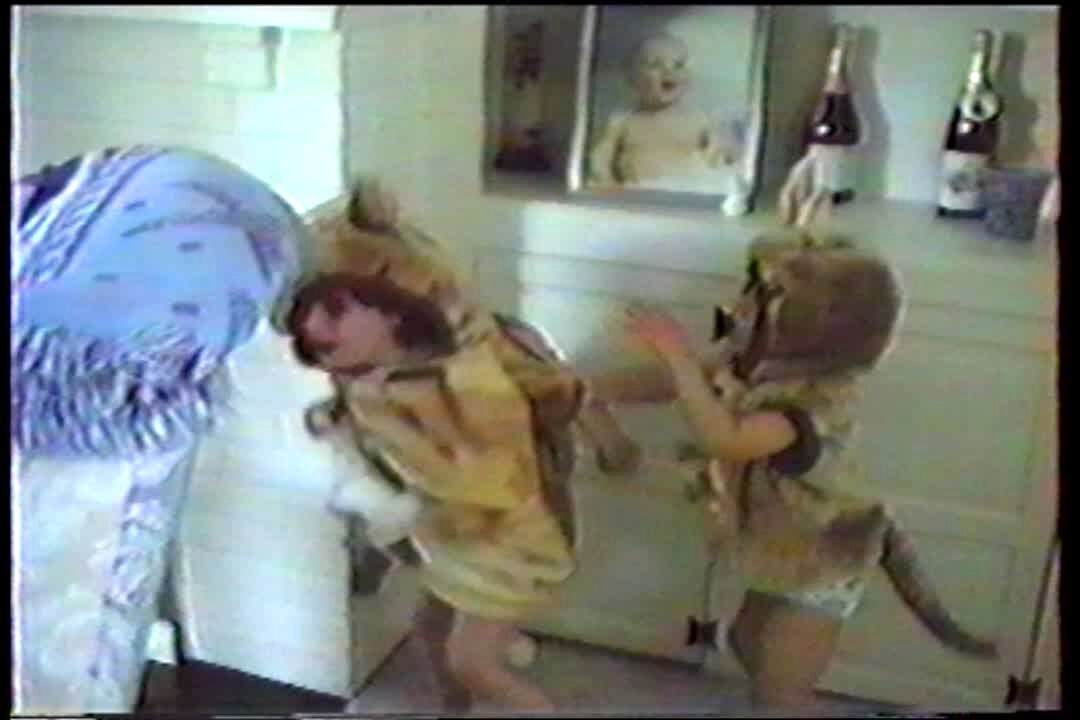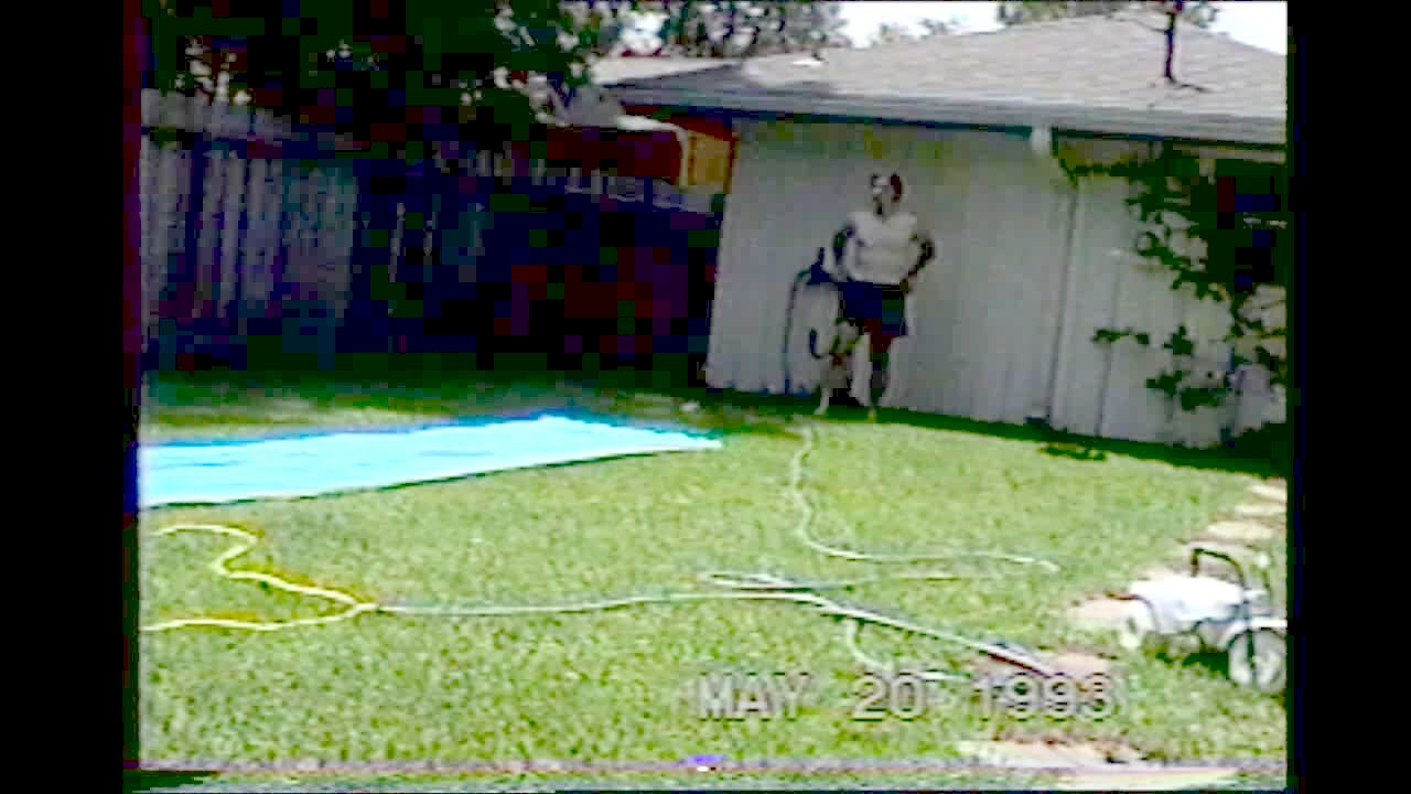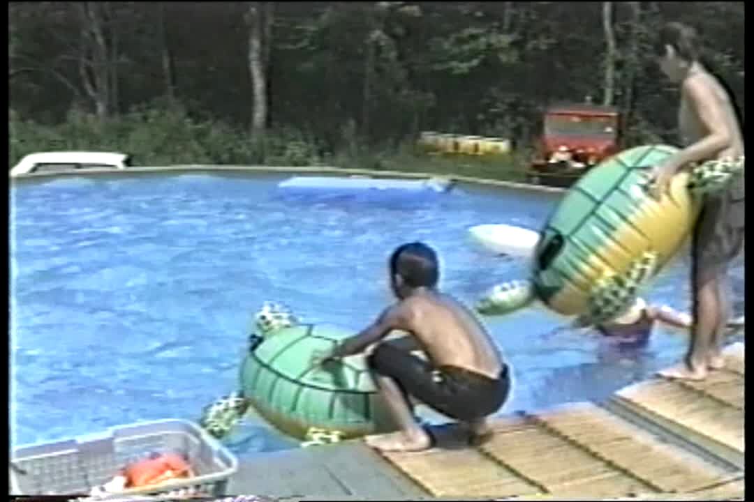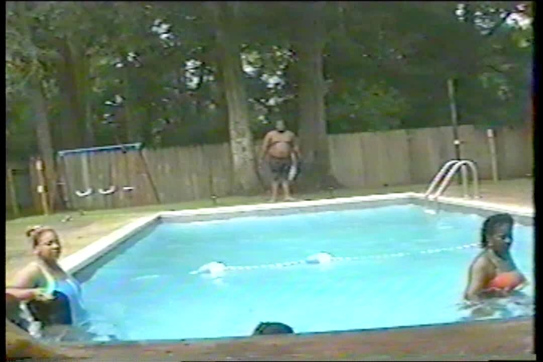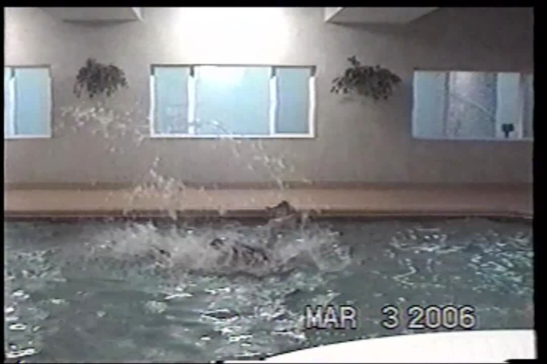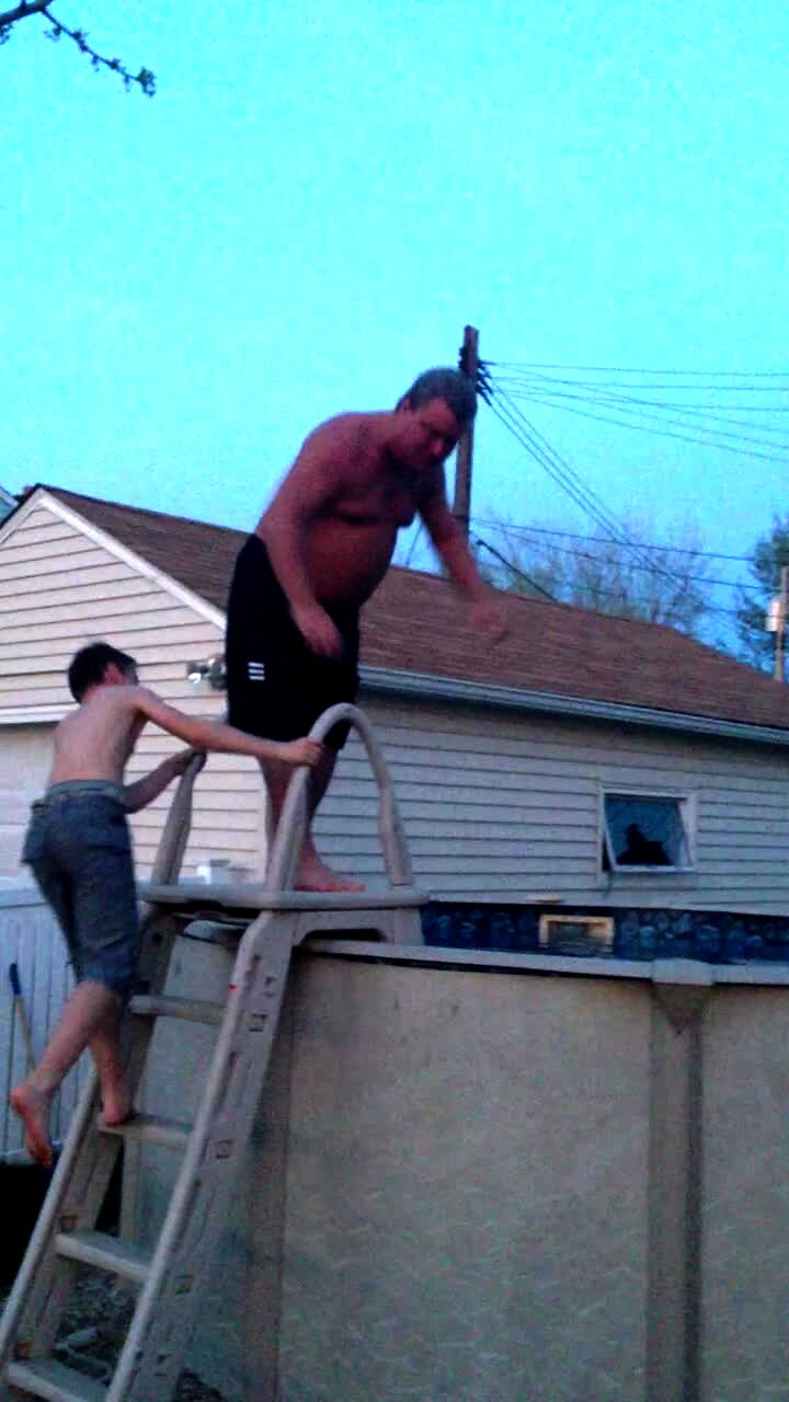 Dad jumps into pool and the diving board falls into pool. No tail.